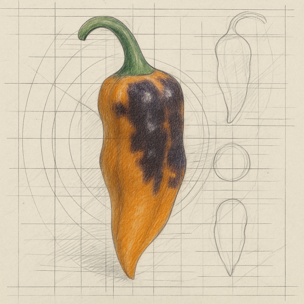 This Capsicum chinense dominant cross with C. frutescens is a striking and superhot variety developed by Towns-End Chili & Spice from a Purple/Red Bhut Jolokia cross in 2017. Now at F5, this pepper matures from a purple-green hue to a blushed peach tone, often with bleeding through the flesh. Pods are elongated (3–6 cm) and deliver a very hot, citrusy-earthy punch. Plants are tall, with purple-green foliage and light purple flowers. A medium producer that thrives in milder temperatures—perfect for those seeking heat with visual flair.